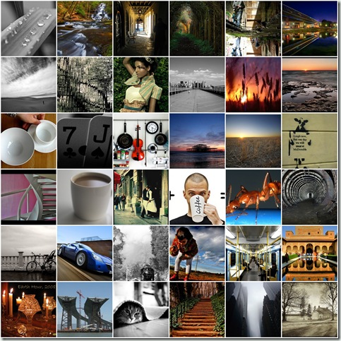 1. Leaves B&W, 2. Coming Down, 3. atmosphere in pasadena..., 4. The magical mystery tour, 5. pw1, 6. Untitled, 7. walking, 8. abstract lines, 9. Untitled, 10. going to Manhattan is prohibited, 11. six twenty nine, 12. Points of Light, 13. the breakfast boogie., 14. Jack7Off, 15. Kitchen Symphony, 16. West Pier Starlings, Brighton, 17. Pin-Sharp (Vertorama), 18. Laugh now..., 19. lns & crvs, 20. Friday Morning Coffee, 21. La serveuse ..., 22. Me + Coffee = Yippee!!!, 23. A formiga..., 24. Going Underground...., 25. Untitled, 26. VX220 Rig, 27. MEMORIES., 28. shooting the bug, 29. Untitled, 30. Palacios Nazaries - Alhambra - Granada, 31. Earth Hour, 2008, 32. Bay Bridge under construction, 33. .0607, 34. path, 35. Foggy corridor, 36. Stevens House Sunset